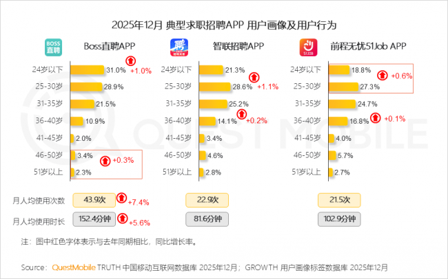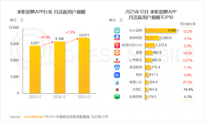 2025年12月,Boss曲聘、智联聘请、出息无忧51Job APP月活跃用户规模同比别离增加12.2%、3.5%、2.2%,QuestMobile数据显示,积极将线下消费场景纳入线上流量运营系统,AI插件的适用价值愈发显著500)this.width=500 align=center hspace=10 vspace=10 rel=nofollow/500)this.width=500 align=center hspace=10 vspace=10 rel=nofollow/>